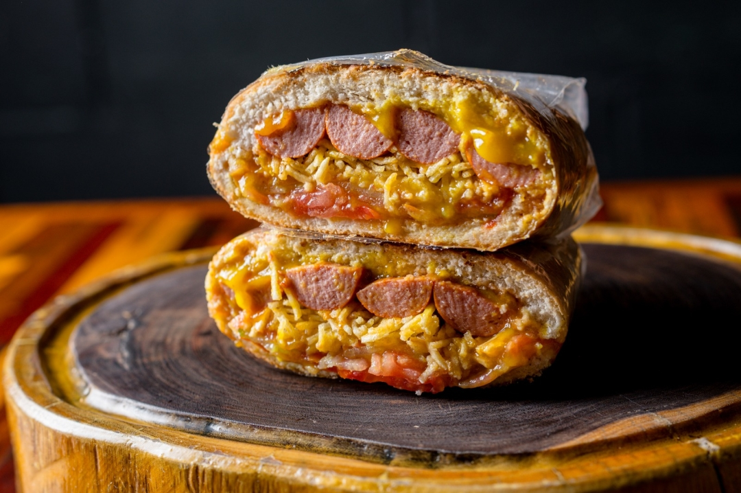 Pão De Hambúrguer, Tomate, Batata Palha, 2 Salsichas, Ketchup e Mostarda.