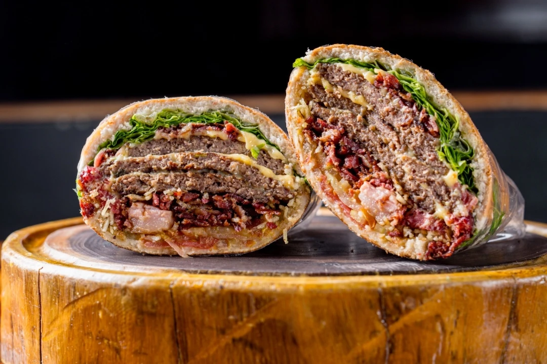 Pão De Hambúrguer, Tomate, Alface Ou Rúcula, Bacon, Batata Palha, 2 Queijos Prato, 2 Hambúrgueres (90g), 2 Ovos E Catupiry Original . Cortado Ao Meio Com Coberura Extra De Catupiry Original.