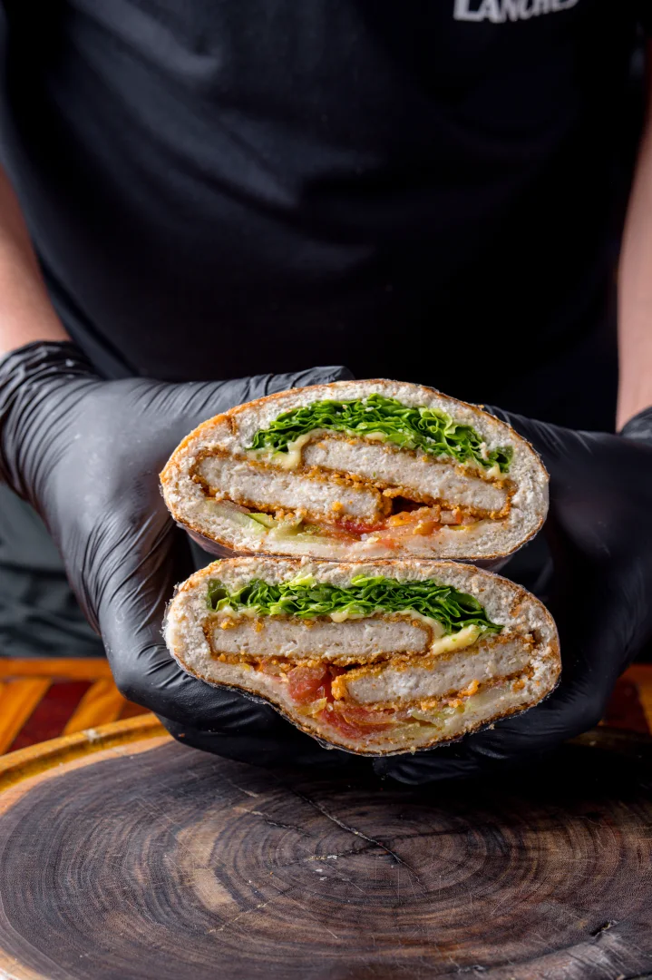 Pão De Hambúrguer, Tomate, Alface Ou Rúcula, 02 Queijos Prato, 2 Steaks De Frango (100g Cada) e Maionese de Rúcula