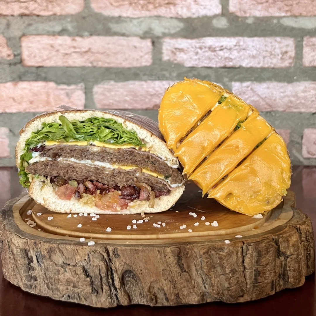 Pão De Hambúrguer, Tomate, Alface Ou Rúcula, Bacon, Batata Palha, 2 Queijos Prato, 2 Hambúrgueres (90g), 2 Ovos, Frango, Calabresa E Catupiry Original. Serve até duas pessoas.