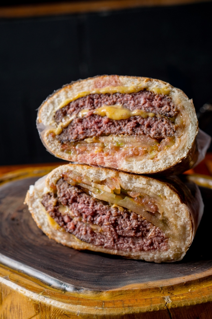 Pão, Tomate, Alface, 2 Hambúrgueres (180g), 2 fatias de Queijo Prato, 2 Ovos e Bacon