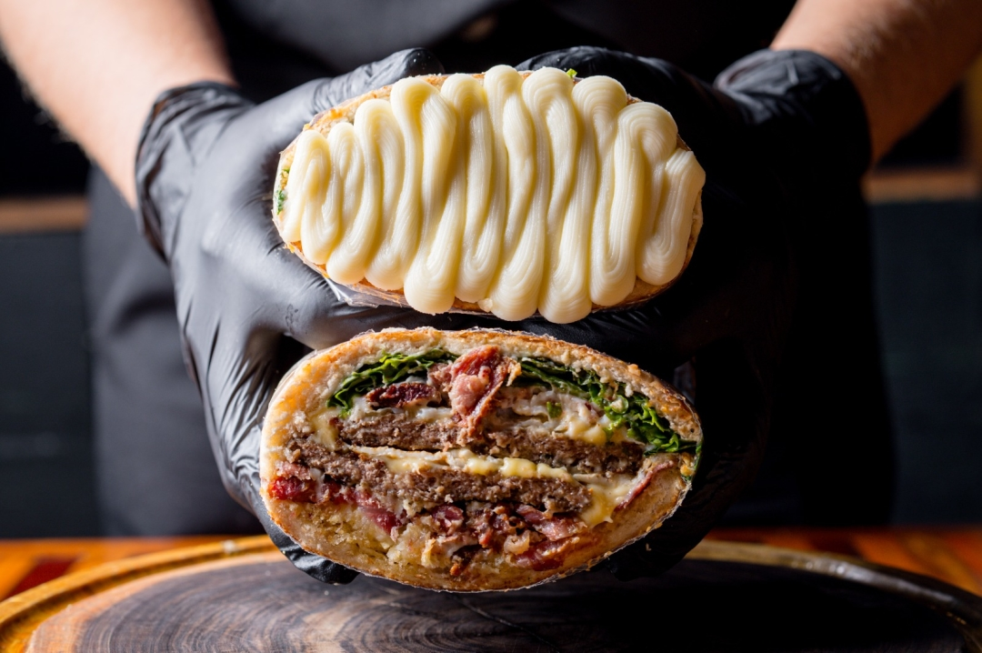 Pão De Hambúrguer, Tomate, Alface Ou Rúcula, Bacon, Batata Palha, 2 Queijos Prato, 2 Hambúrgueres (90g), 2 Ovos, Frango, Calabresa E Catupiry Original. Serve até duas pessoas.