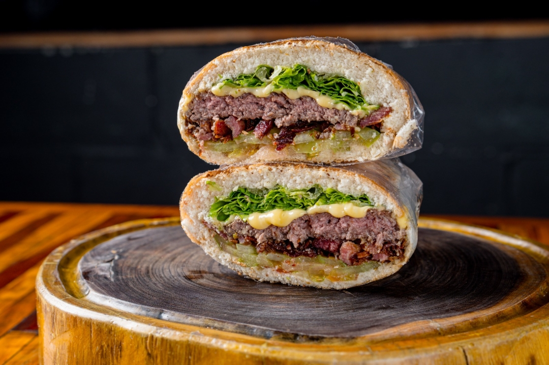 Pão, Tomate, Alface, 2 Hambúrgueres (180g), 2 fatias de Queijo Prato, 2 Ovos e Bacon