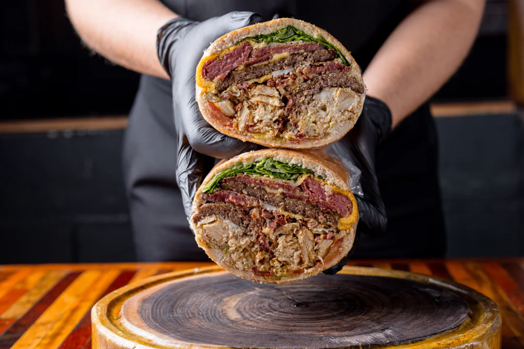 Pão De Hambúrguer, Tomate, Alface Ou Rúcula, Bacon, Batata Palha, 2 Queijos Prato, 2 Hambúrgueres (90g), 2 Ovos, Frango, Calabresa E Catupiry Original. Serve até duas pessoas.