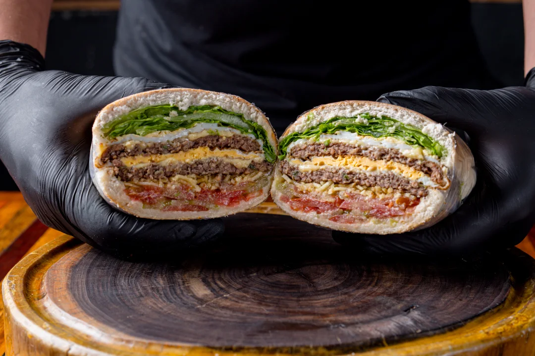 Pão De Hambúrguer, Tomate, Alface Ou Rúcula, Batata Palha, 2 Queijos Prato, 2 Hambúrgueres (90g) E 2 Ovos.