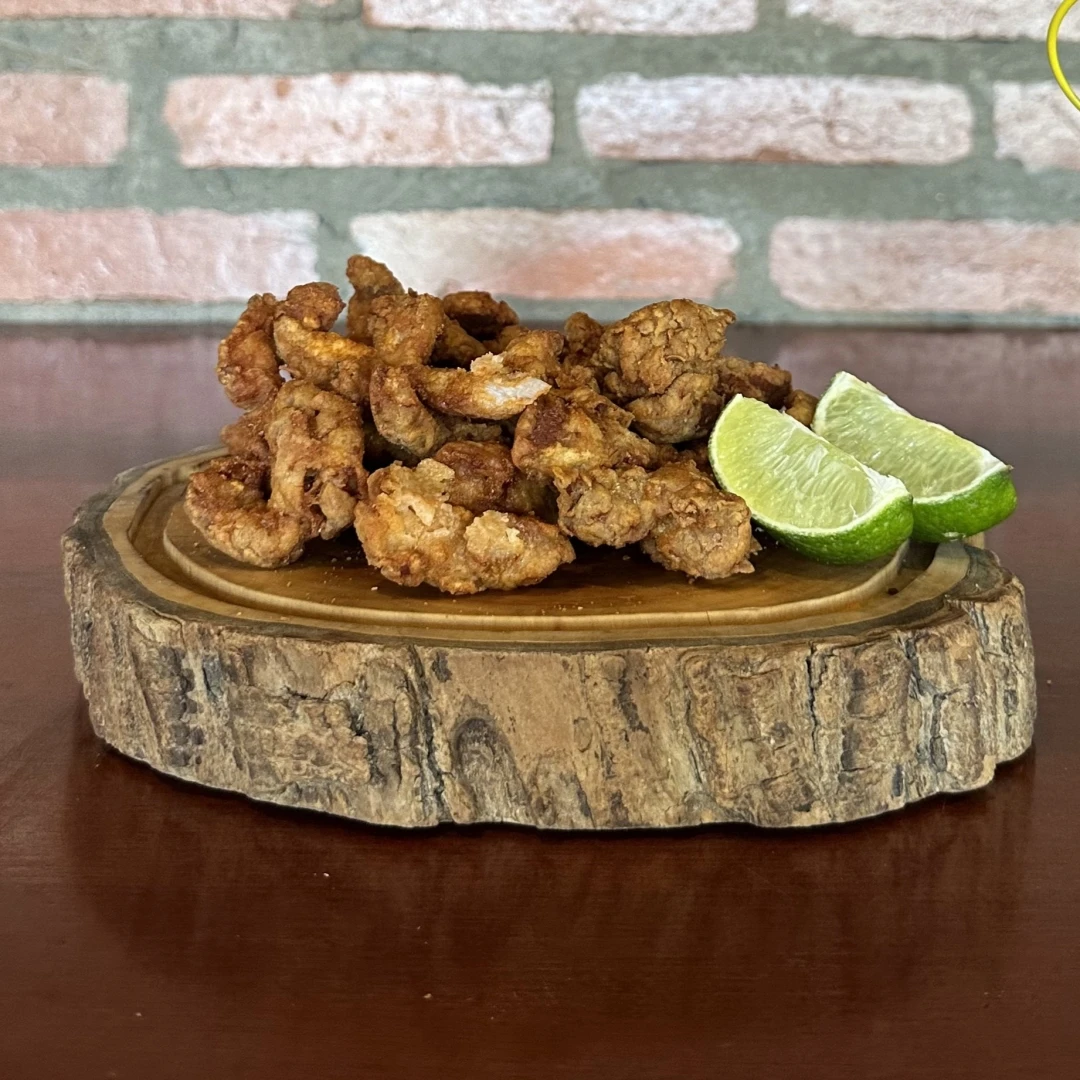 DELICIOSAS & CROCANTES ISCAS DE PANCETA, MARINADA 12 HORAS NO LIMÃO, COM TEMPEROS ESPECIAIS E EMPANADAS. (400 gramas)